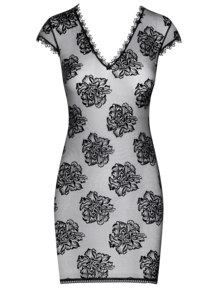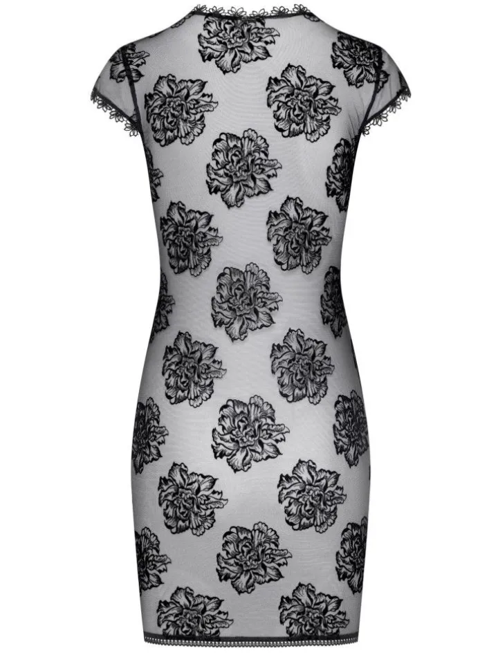 Das kurze, schwarze Lingerie Kleid von Cadolle ist ein eleganter Hauch von Nichts… Es besteht aus transparentem, schwarzem Tüll, welcher mit einem Flock-Velour Blumenmuster bedruckt ist. Das Kleidchen ist ungefüttert und daher transparent. Es hat kurze Ärmel und Spitzenverzierungen am Ausschnitt.