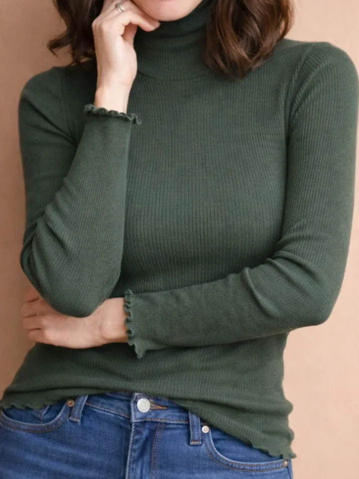 Das feine Rollkragen-Shirt Wolle-Seide besteht aus einem besonders hochwertigen, rundgestrickten und gerippten Jersey aus 70% extrafeiner Merinowolle und 30% Seide. Dieses edle Shirt mit langen Ärmeln ist ca. 60 cm lang. Der untere Saum und die Ärmelenden sind wellig umkettelt. Das Shirt hat einen hohen Rollkragen, den man auf der gewünschten Höhe umschlagen kann. Das Material ist eine rundgestrickte „Schlauchware“ und daher ist dieses Shirt seitlich nahtlos.