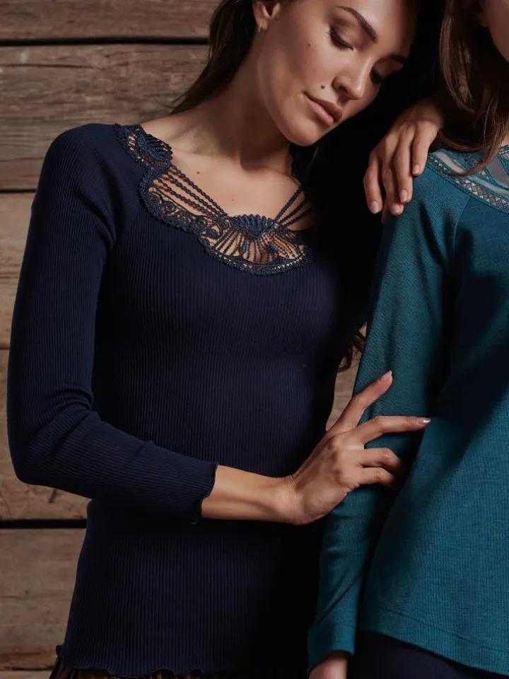 Das Grundmaterial dieser Wäsche Serie ist ein gerippter Wolle-Seide Jersey und in tief dunklem blau erhältlich. Dieses Material ist hautsympathisch und angenehm zu tragen und hat einen zarten Schimmer. Wolle-Seide wirkt temperaturausgleichend, knittert nicht und trocknet schnell. Sie wärmt im Winter und ist ausgleichend in der Übergangszeit. Außerdem ist dieses edle Material leicht elastisch und passt sich daher gut der Körperkontur an.