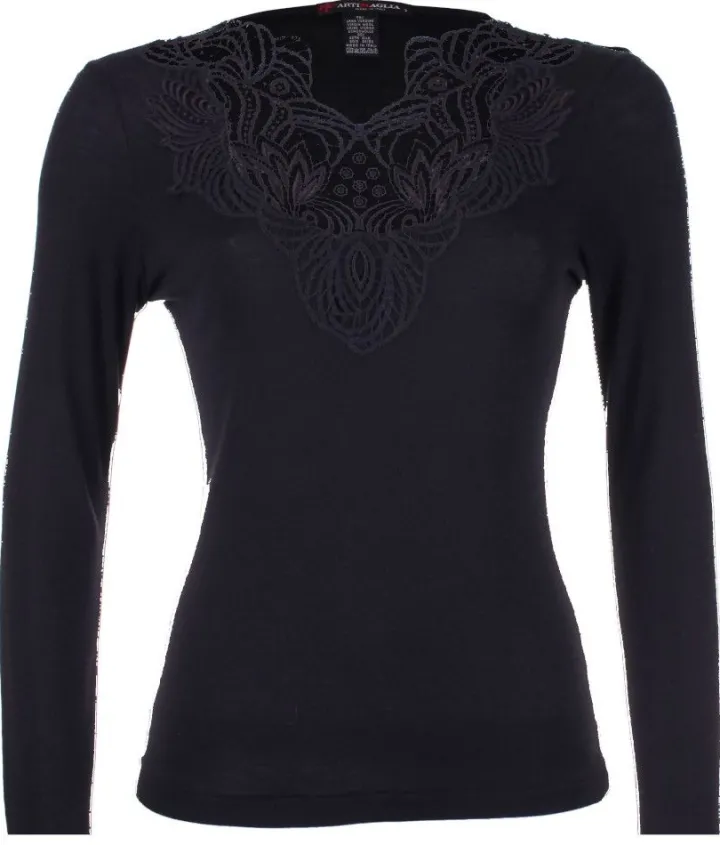 Das Langarm Shirt Wolle-Seide besteht aus einem besonders hochwertigen glatten Jersey aus 70% extrafeiner Merinowolle und 30% Seide in Kombination mit einer besonders hochwertigen Makramee Spitze von der schweizer Marke Bischoff aus St. Gallen. Dieses edle Shirt hat lange Ärmel, eine Gesamtlänge von ca. 60 cm und einen V-Ausschnitt mit Spitzenbesatz.