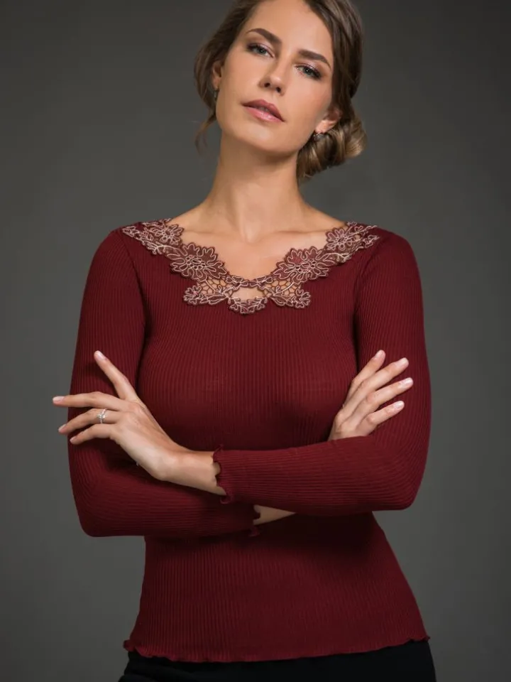 Das Langarm Top Wolle-Seide besteht aus einem besonders hochwertigen gerippten Jersey aus 70% extrafeiner Merinowolle und 30% Seide in Kombination mit einer luxuriösen, bestickten Spitze. Dieses edle Shirt hat lange Ärmel und eine Gesamtlänge von ca. 60 cm. Das Decolleté ist mit Blüten-Spitze gestaltet.