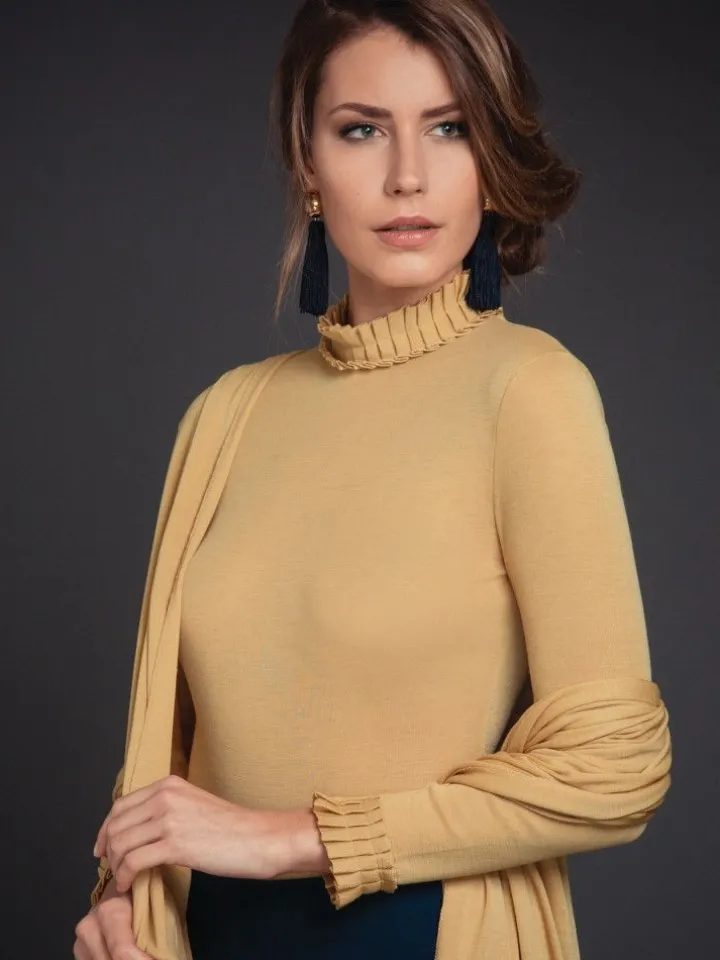 Das Langarm Shirt Wolle-Seide besteht aus einem besonders hochwertigen Jersey aus 70% extrafeiner Merinowolle und 30% Seide in Kombination mit einer raffinierten Kragen-Gestaltung im Plissee-Look. Dieses edle Langarmshirt hat lange Ärmel, eine Gesamtlänge von ca. 60 cm und einen Stehkragen, der mit einer festgenähten Bordüre im Plissee-Falten Look benäht ist. Die Ärmelenden sind ebenfalls mit diesem Material gestaltet und der Kragen wird auf der Rückseite mit zwei kleinen Knöpfen geschlossen.