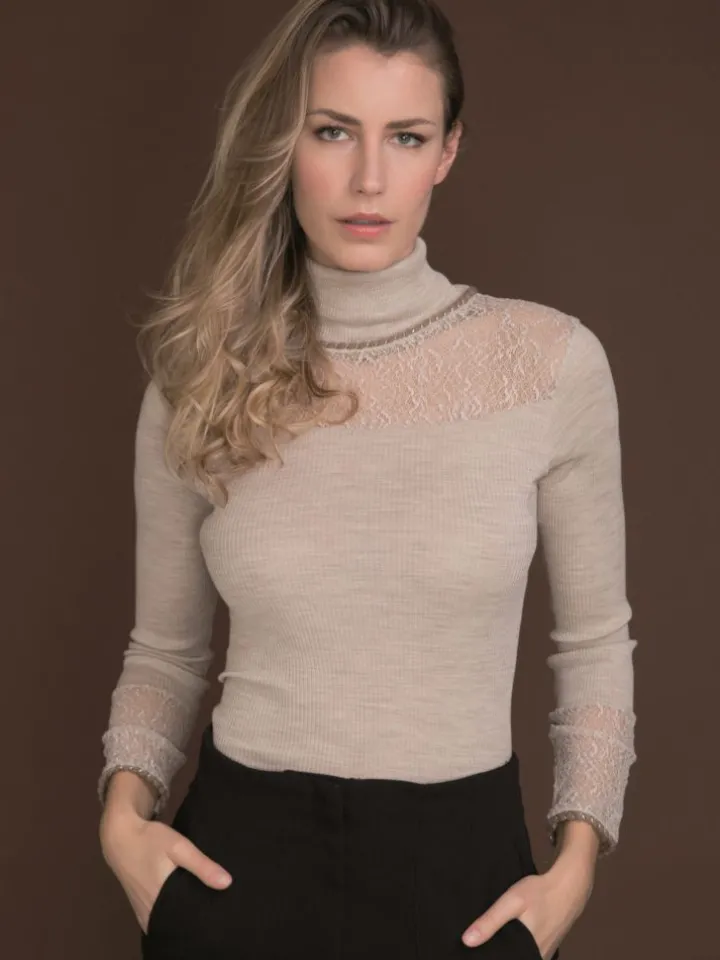 Das Rollkragen Shirt Wolle-Seide besteht aus einem besonders hochwertigen, geripptem Jersey aus 70% extrafeiner Merinowolle und 30% Seide in Kombination mit einer feinen Netzspitze. Dieses edle Rollkragenshirt hat lange Ärmel, eine Gesamtlänge von ca. 60 cm und einen Rollkragen. Das Decolleté ist mit Netz-Spitze gestaltet und das Shirt ist am Hals und den Ärmelenden mit einer dicken Kordel mit Goldglitzer-Details verziert.