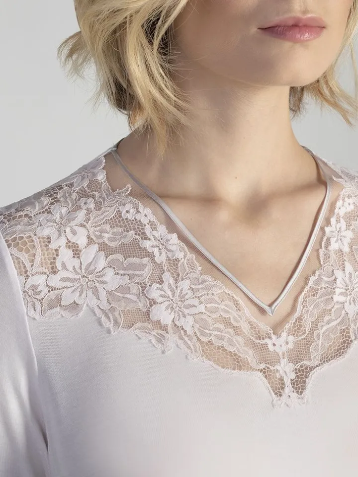 Das knielange Nachtkleid von Verdiani besteht aus weichem Micro-Modal in einer hautsympathischen, elastischen Jersey-Qualität (94% Modal, 6% Elasthan). Es ist Made in Italy und in den Größen 36 bis 46 erhältlich. Dieses Langarm Nachthemd ist ca. 95 cm lang. Es hat lange Ärmel und das Dekolleté ist ausgearbeitet mit feiner Blütenspitze und edlem Tüll.