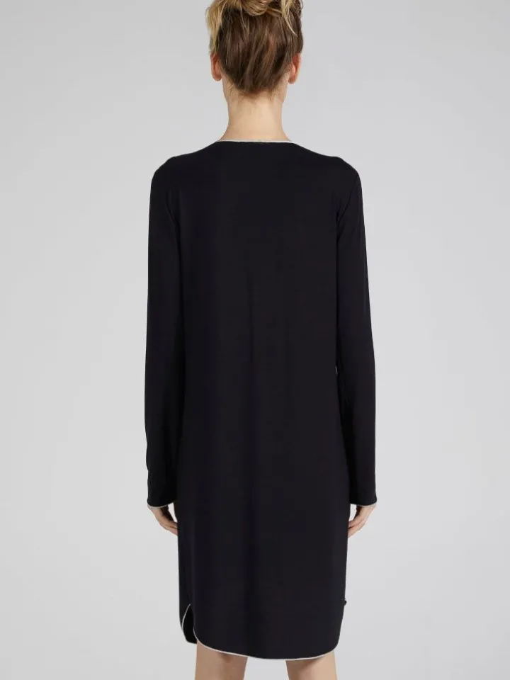 Das halb-lange Nachtkleid WKND No. 3 schwarz-puder von Verdiani Weekend besteht aus weichem Micro-Modal in einer hautsympathischen, elastischen Jersey-Qualität (92% Modal, 8% Elasthan). Es ist Made in Italy und in den Größen 36 bis 44 erhältlich. Dieses bezaubernde Nachtkleid ist ca. 95 cm lang. Es hat lange Ärmel. Das Decollete ist mit Kontrastnähten gestaltet und hat eine kurze Knopfleiste mit Perlmutt Knöpfen.