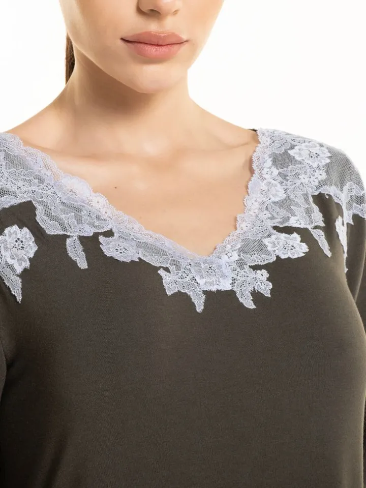 Das knielange Nachtshirt Mirabella von Verdiani ist aus einem sehr feinen und weichen Modaljersey (92% Modal, 8% Elasthan) gefertigt. Das Nachtkleid hat einen V-Ausschnitt, welcher mit einer weißen Blumenspitze verziert wird. Das Kleid ist ca 95 cm lang und hat lange Ärmel.