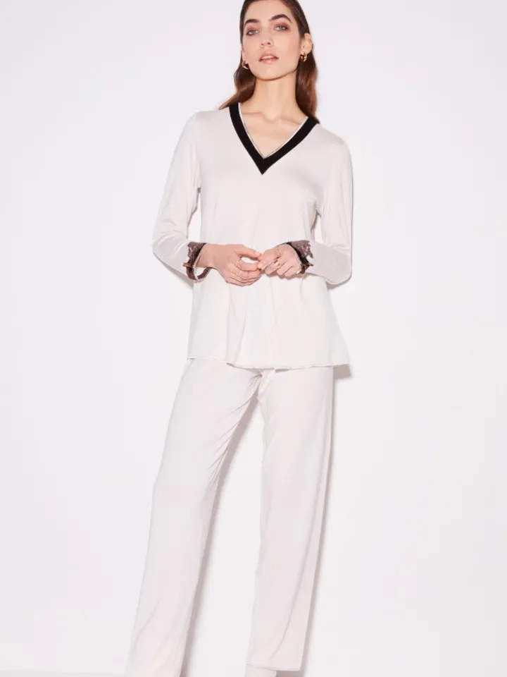 Der lange Damen-Pyjama von Chiara Fiorini besteht aus superweichem Micro-Modal in einer hautsympathischen, elastischen Jersey-Qualität (96% Modal, 4% Elasthan). Er ist Made in Italy und in den Größen 36 bis 46 erhältlich. Dieser Pyjama hat ein ca. 65 cm langes Oberteil mit langen Ärmeln und verzierten Bündchen. Das Oberteil hat einen V-Ausschnitt mit Samteinsatz und einer Kellerfalte, welche das Oberteil besonders bequem und A-Linienförmig gestaltet. Die zugehörige Hose hat gerade Beine und einen Gummibund mit Samtschleife. Durch die dunkelbraunen Aktzente an Ober- und Unterteil gewinnt der schlichte Pyjama an schöner Besonderheit.