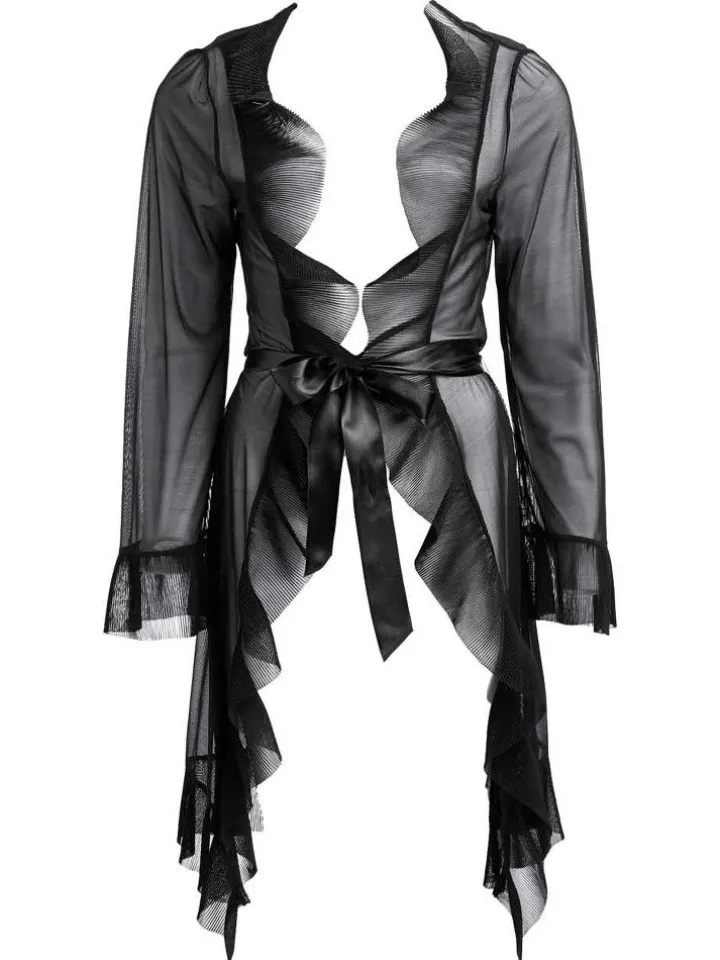 | Merkmale | transparent, Langarm, Bindegürtel, Materialkombination |