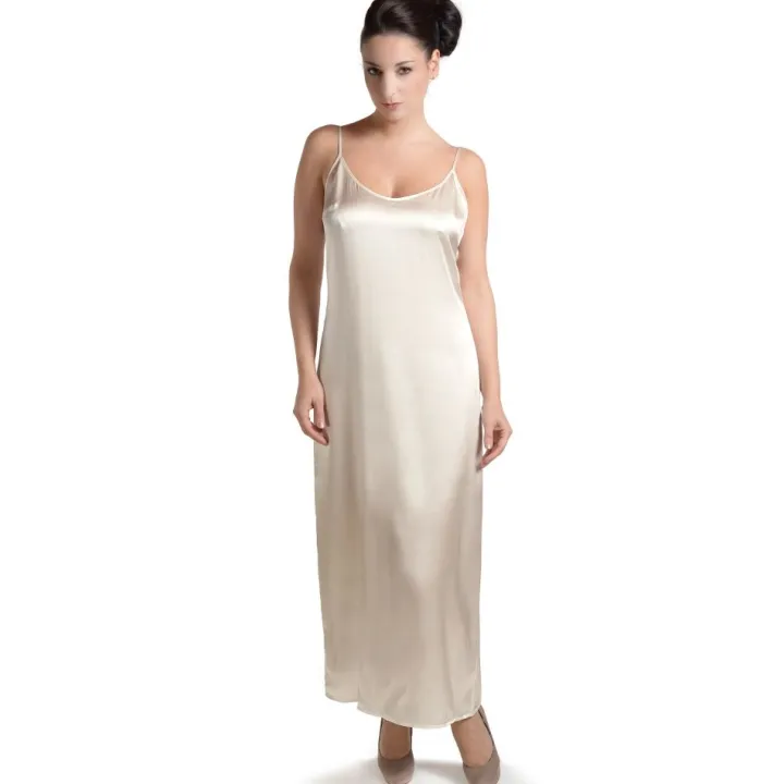 Dieses verführerische Seidennachthemd aus hochwertigem Seidensatin (100% Seide) ist mit verstellbarem Spaghettiträger ausgestattet. Dieses klassische lange Seidennachthemd gibt es in der Farbe Champagner-weiß.