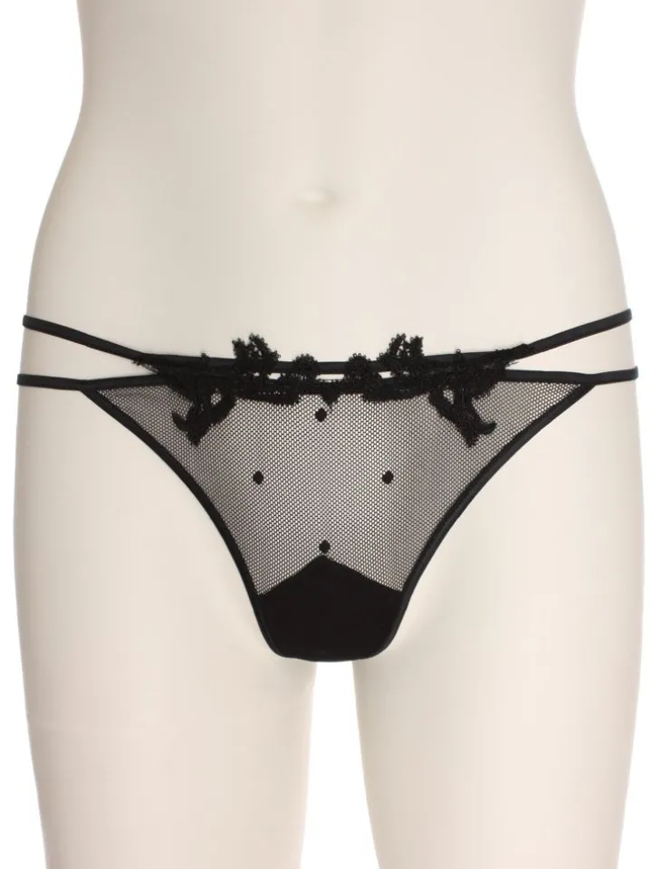 Der Tüll Ouvert String Pepper aus der limitierten RC Private Collection „Black Mirror“ von RCrescentini besteht aus elastischer, schwarzer Spitze und gepunktetem Tüll. Das transparente Tüllmaterial ist kombiniert mit elastischen Bändern aus schwarzem Satin.