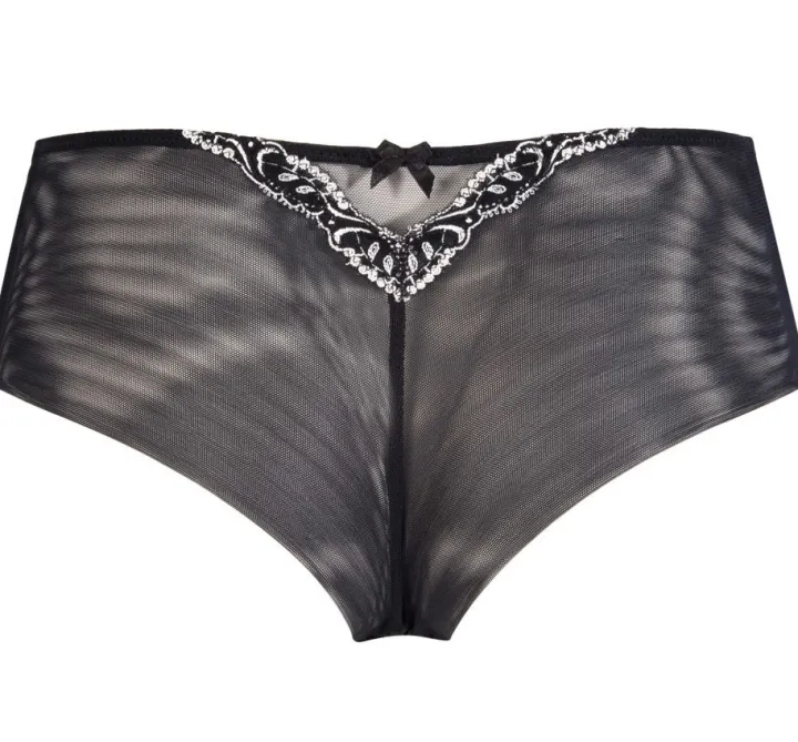 Der bezaubernde Slip ist vorne aus feiner Seide und besticktem Tüll. Die Seiten und die Rückseite sind komplett aus Tüll und daher leicht transparent. Hinten ist eine kleine Stickerei V-Förmig angebracht, um mehr Form und Linie in den Slip zu bringen. Diese Detail ist zusätzlich mit einer zarten Zierschleife versehen. Der Slip ist in knapper Panty/Shorty Form geschnitten und erzeugt somit einen frechen und zugleich verführerischen Look. Das Panty hat einen weichen Baumwollzwickel. Der aufregende Schnitt, die hochwertigen Materialien und zarten Details machen aus diesem Slip ein aufregendes, unwiderstehliches Wäscheunterteil, dass sowohl für den Alltag als auch für besondere Anlässe perfekt geeignet ist. Aus dieser zarten Kollektion gibt es weitere, ergänzende Kombinationsteile seperat in unserem Shop.