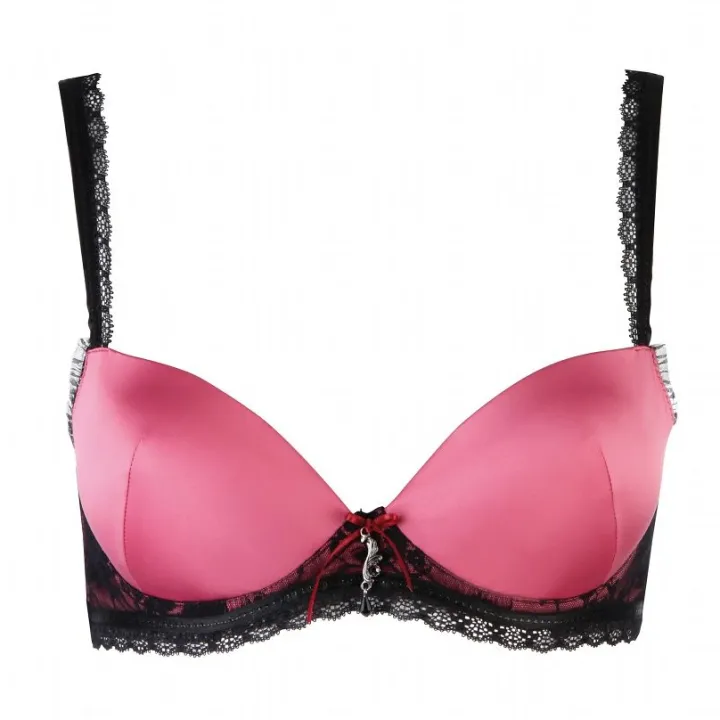 Dieser Push-Up BH besteht aus fuchsia-pinkem Stretch-Satin und schwarzer Spitze. Die ausgeformten Schalen mit Bügel sind leicht geschäumt und haben ein integriertes Push-Up Polster – für ein traumhaftes Decolleté. Die elastischen Träger sind längenverstellbar und mit Spitze benäht. Das Decolleté ziert ein Satin-Schleifchen und ein Schmuckanhänger mit Schmuckkristall. Der Push-Up BH ist mit B- oder C-Cup in den Größen 36-42 erhältlich. er wird auf der Rückseite mit einem dreifach verstellbaren Häkchenverschluss geschlossen.