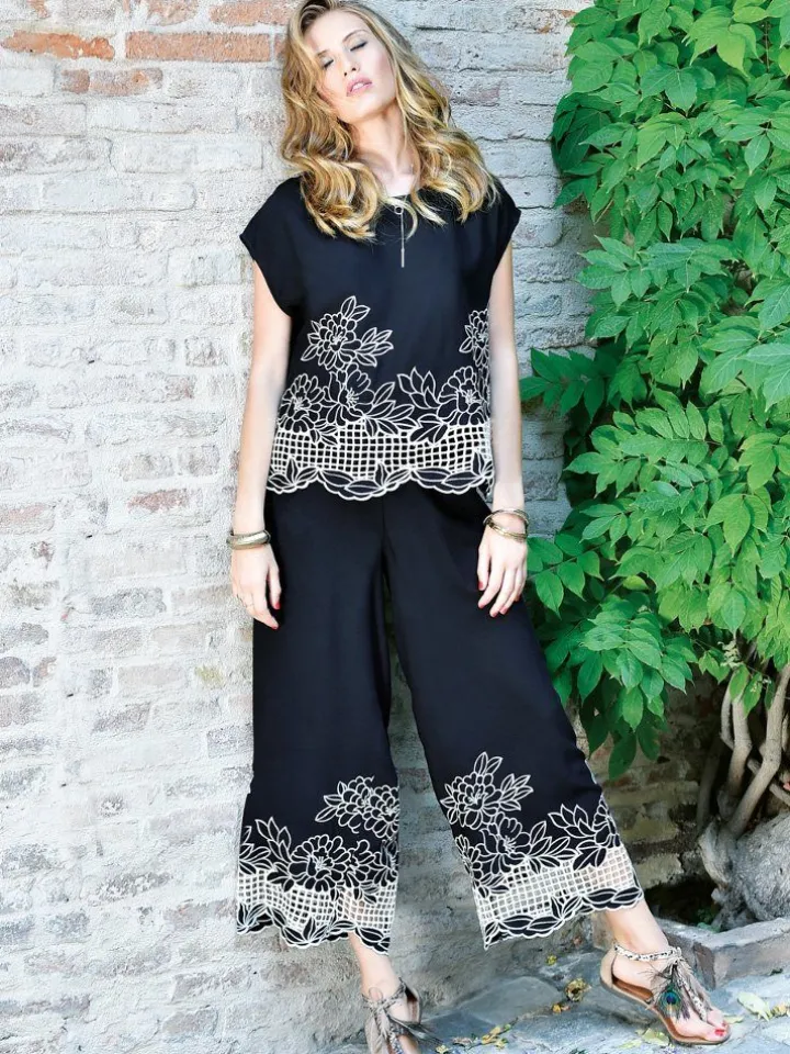 Der Resortwear Anzug Nero von Chiara Fiorini besteht aus Baumwolle/Viscose in einer luftig leichten, gewebten Qualität (70% Viscose, 30% Baumwolle). Er ist Made in Italy und in den Größen 36 bis 42 erhältlich. Ausverkaufte Größen sind hier nicht nachbestellbar. Dieser legere Resortwear Anzug ist 2-teilig mit einem ärmellosen Oberteil und besteht aus einem fantastisch leichten, schwarzen Sommermaterial, welches creme-weiß bestickt ist und mit einer verführerischen Hohlsaumstickerei kombiniert wurde.
