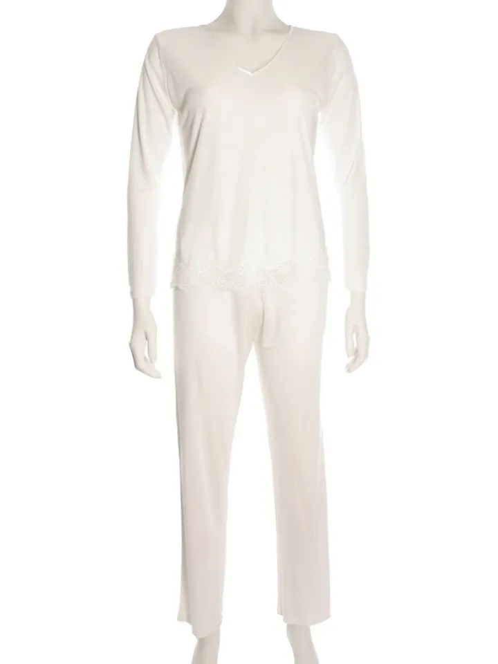Dieser Schlafanzug aus Seidenjersey hat lange Ärmel und einen V-Ausschnitt. Der fließend weiche Jersey mit einem Seidenanteil von 60% verfügt über ein Flächengewicht von 150 g/m². Er ist elastisch und schmiegt sich schmeichelnd figurbetont an den Körper an. Der untere Saum des Oberteils ist mit einer breiten Spitze benäht. Die Hose ist mit einem bequemem Gummizug ausgestattet.