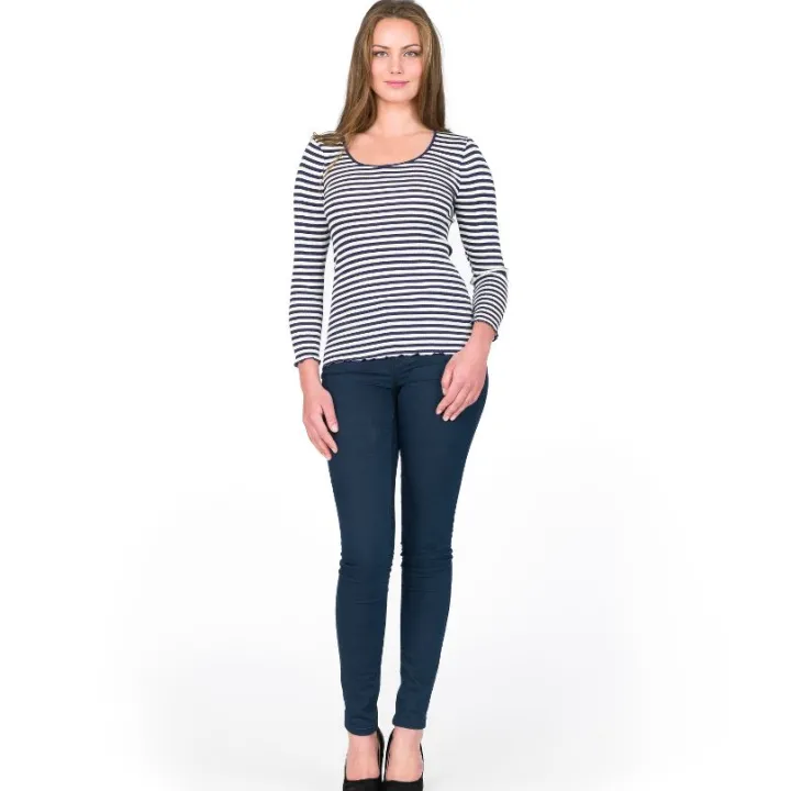 Das Seide-Baumwolle Langarm-Shirt Arona ist aus hautsympathischem Ripp- Jersey in einer feinen Seide-Baumwolle Mischung (70% Seide) hergestellt. Dieses Shirt ist ein temperierendes Unterziehshirt mit langen Ärmeln aus der Seide-Baumwolle Unterwäsche Kollektion Arona von Gattina Dessous. Mit den fröhlichen Ringeln in schwarz-weiß oder marineblau-weiß ist dieses Langarm-Shirt aber auch als leichte Oberbekleidung kombinationsstark verwendbar.