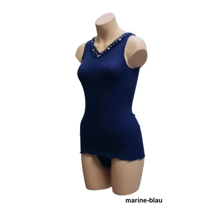 Das Seide-Baumwolle Unterhemd Fiocca ist aus hautsympathischen Rippjersey in einer feinen Seide-Baumwolle Mischung (50% Seide) hergestellt. Dieses temperierende Unterziehshirt mit breiten Trägern aus der Seide-Baumwolle Unterwäsche Kollektion Fiocca von Gattina Dessous kann zum Drunterziehen oder als Top verwendet werden. Am Ausschnitt ist es mit einer Applikation aus kleinen Satinblumen und aufgestickten Kunstperlen verziert.