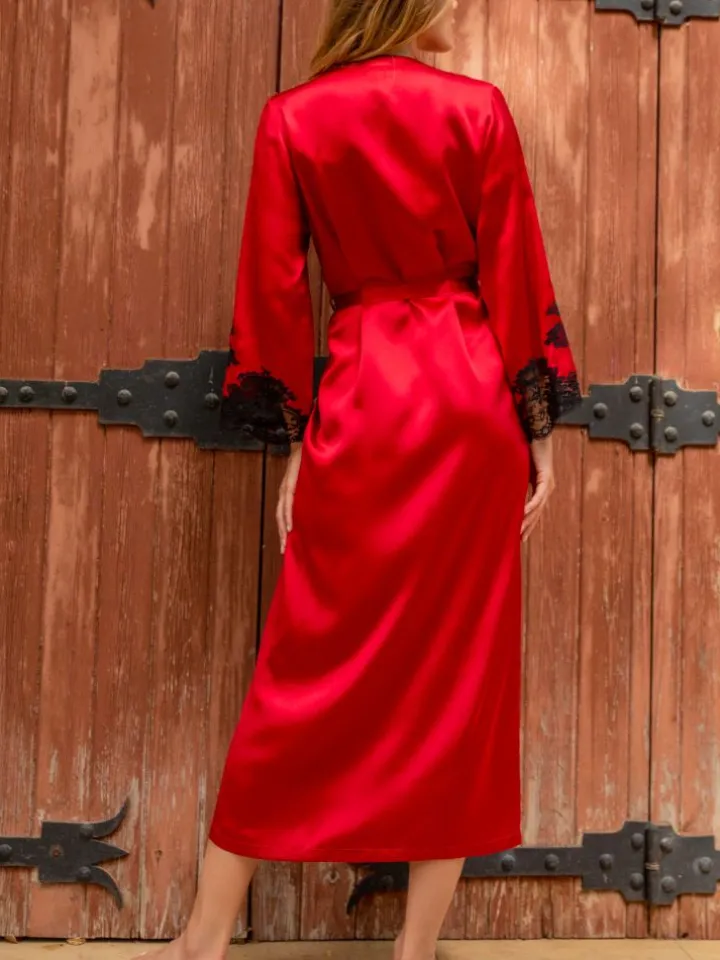 Ein langer Morgenmantel der Luxusklasse ist der Seiden-Morgenmantel Marjolie No. 9 der französischen Edel-Marke Marjolaine. Der edle Seidensatin aus reiner Seide wurde mit exquisiter Calais Spitze zu einer aufregenden Nachtwäsche verarbeitet.