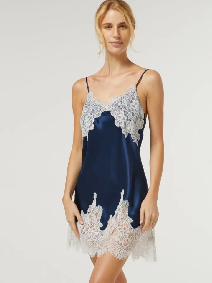 Das kurze Seidennachthemd hat fein gearbeitete in der Länge verstellbare Spaghetti-Träger und ist in der Farbe nachtblau, gold oder oceantürkis mit Spitze erhältlich.
