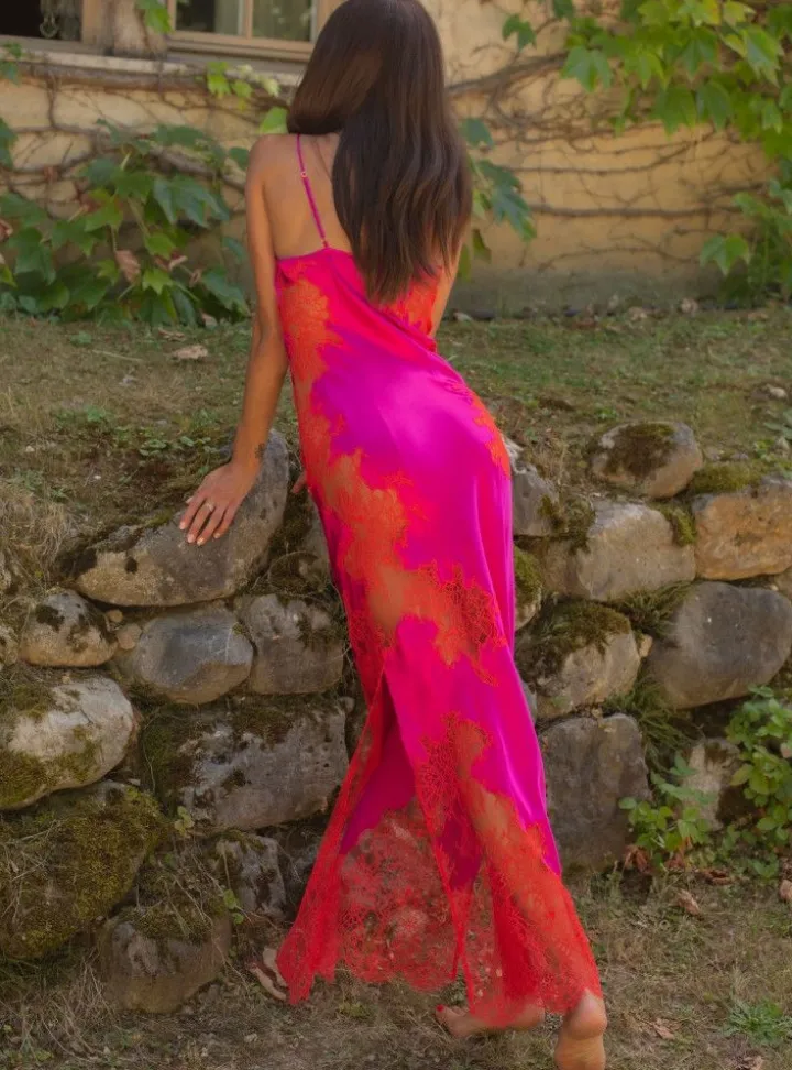 Ein Seidenneglige der Luxusklasse ist das lange Spaghettiträger Neglige Melinda der französischen Edel-Marke Marjolaine. Der edle Seidensatin aus 92% Seide und 8% Elasthan wurde mit exquisiter Blumen-Spitze (100% Nylon) zu einer aufregenden Seidenwäsche verarbeitet. Die exquisite Eye-Lash-Spitze hat ein Blumenmuster und ist bei diesem Modell besonders reichlich verarbeitet worden.