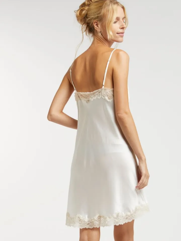 Das kurze Seidennachthemd Loretta fällt geradlinig und hat hat fein gearbeitete in der Länge verstellbare Spaghetti-Träger. Es ist in der Farbe elfenbein-weiß erhältlich. Mit der klassischen Farbe und dem geraden Schnitt ist es auch als Unterkleid verwendbar.