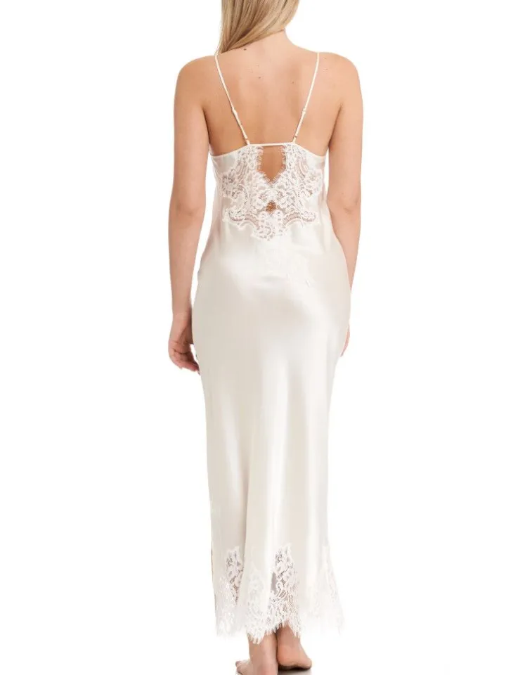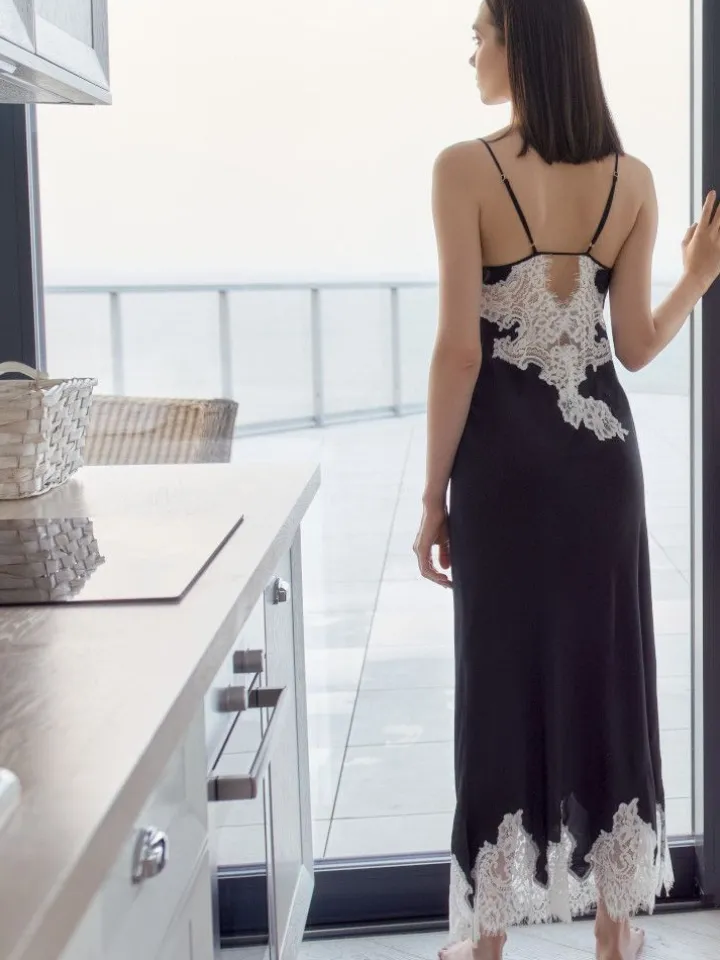 Dieses Modell in zeitlosem Schwarz oder feinem Naturweiß und modischem Goldgrün ist in den Größen 36 bis 48 (deutsche Größen) erhältlich. Zusätzlich gibt es saisonal verfügbare Modefarben. Das lange Neglige Mailin hat verstellbare Spaghettiträger, unten seitliche Schlitze am Saum und eine raffinierte Rückengestaltung.