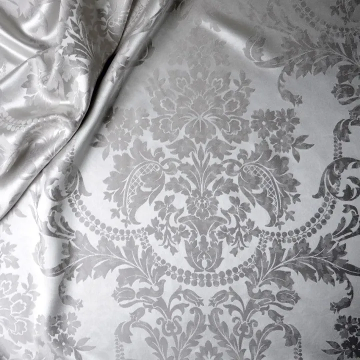 Die garngefärbt gewebte Bettwäsche Portofino Ash besteht aus reiner Seide. Der edel glänzende Jacquard-Satin mit einem fürstlichen Jacquardmuster aus feiner Maulbeerseide ist luxuriös und elegant. Das hochwertige Gewebe aus 100% Seide fällt fließend und hat einen edlen Glanz. Bettwäsche aus reiner Seide ist hautsympathisch und temperaturausgleichend und damit sowohl im Sommer als auch im Winter angenehm. Diese Seidenbettwäsche hat ein Flächengewicht von ca. 110g/m².