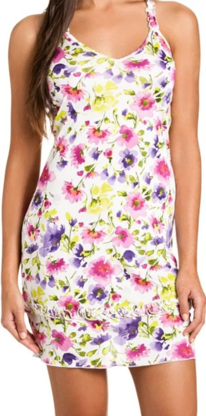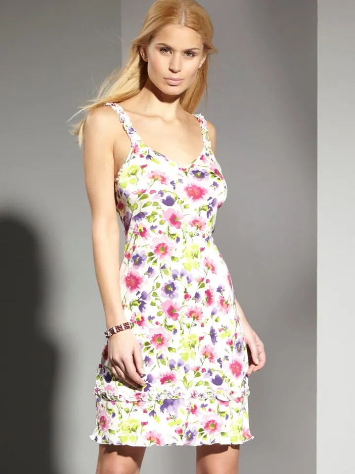 Das kurze Seidennachthemd hat mit Rüschen besetzte Spaghetti-Träger, welche elastisch sind. Der Saum ist umlaufend mit einer Rüsche benäht und es hat eine bequeme Passform. Die optimale Ergänzung ist der separat erhältliche Wickelmantel oder die champagner-weißen Morgenmäntel aus Seidenjersey aus der Tahiti- oder Interlaken-Kollektion (bei uns im Shop separat erhältlich). Mit dem sommerlichen Blumendruck auf champagner-weißem Grund ist dieses Seiden-Nachthemd auch als bequemes Hauskleid oder kurzes Strandkleid verwendbar.