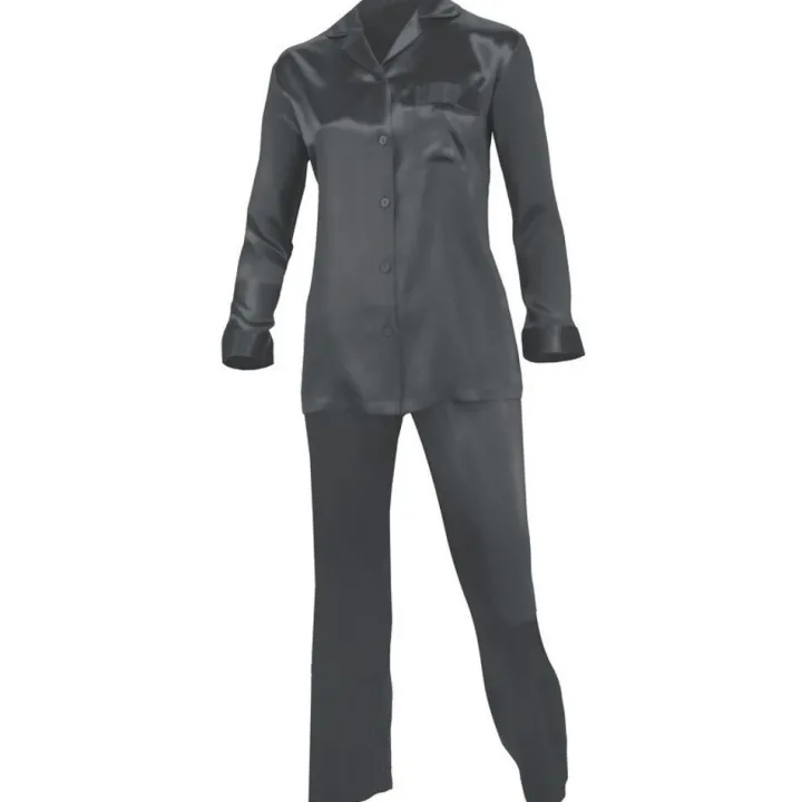 Das edle Stück kann als Schlafanzug oder Hausanzug getragen werden. Das Oberteil ist im klassischen Stil geknöpft und ist mit einer Brusttasche ausgestattet. Die Schlafanzug – Hose hat einen elastischen Bund und kann zusätzlich mit einem Tunnelzug- Bändchen reguliert werden. Er ist in den Größen 36 – 46 (deutsche Damenkonfektionsgrößen) in eleganten Uni-Farben erhältlich.