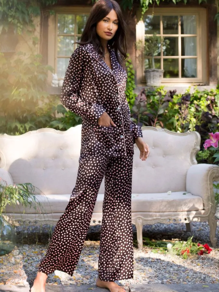 Der lange Seidenpyjama Mitzi der französischen Luxus-Marke Marjolaine ist aus glänzendem Seidensatin (Stretchseide mit 92% Seide, 8% Elasthan) gefertigt. Das edle Material fällt weich und fließend und ist angenehm auf der Haut. Der Satinstoff glänzt elegant und hat ein modisches Punktemuster in rosa auf schokobraunem Grund mit einer rosa Biese.