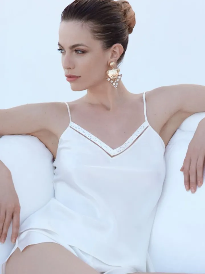 Das Seidentop Jewels mit Spaghetti-Träger besteht aus 100% Seide. Es ist vielseitig kombinierbar, ob als Seidennachtwäsche oder verführerische Damenoberbekleidung. Der V-Ausschnitt ist einem Streifen durchsichtigen Tüll abgesetzt und mit Kristallen verziert.