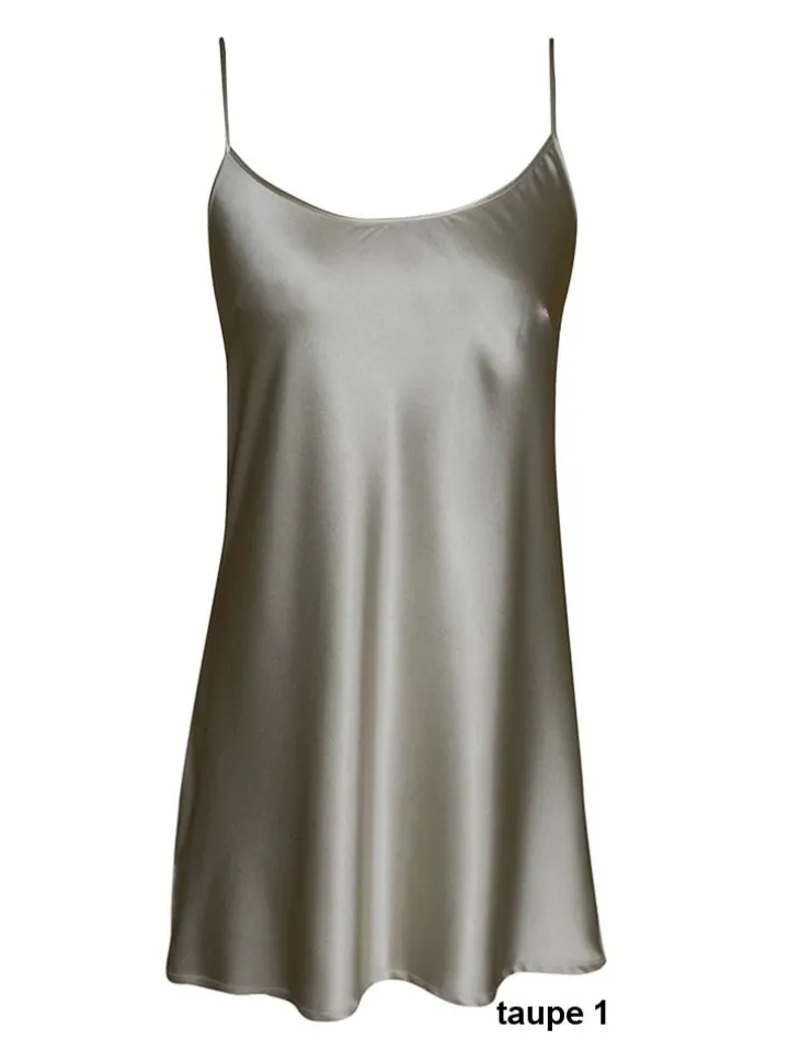 Das verführerische Unterkleid ist kurz geschnitten (Länge ca. 90 cm) und besteht aus hochwertig fein gewebtem Seidensatin. Das kurze Unterkleid eignet sich auch als edles Seidennachthemd. Ein seitlicher Schlitz sorgt für Tragekomfort und eine verführerische Silhouette. Es ist mit verstellbaren Spaghettiträgern ausgestattet und ist in den folgenden kombinationsstarken Farben erhältlich: