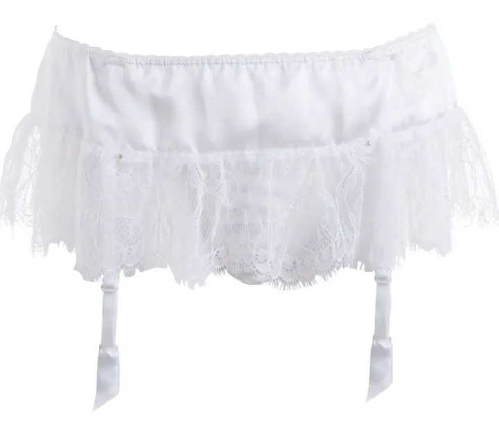 Diese raffinierte Seidenwäsche ist eine Kombination von Strapsgürtel und Seiden-String: ein zierlicher String aus Seidensatin und Tüll wird von einem breiten Saum aus Seide und Spitze wie ein „Röckchen“ umspielt. Daran sind 4 abnehmbare Strapse angenäht, mit welchen man halterlose Strümpfe befestigen kann.