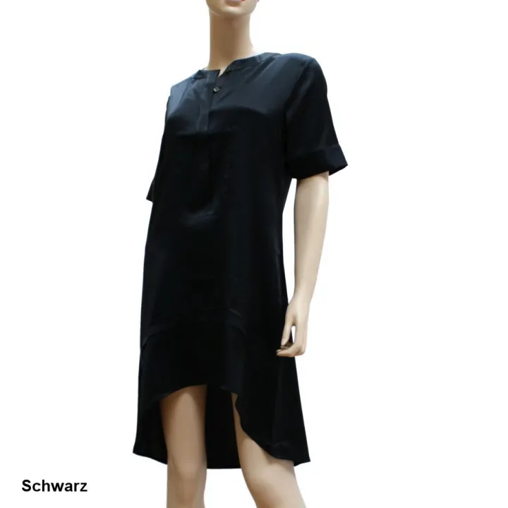 Kurz geschnittenes Nachthemd mit kurzen Ärmeln (Länge ca. 95 cm) und von Gattina Dessous. Das Seidennachthemd aus Stretchseide ist assymetrisch geschnitten – die Vorderseite ist etwa 10 cm kürzer wie die Rückseite – und fällt in bequemer A-Linie. Am Ausschnitt wird es mit einer kurzen Knopfleiste geschlossen. Seidensatin fällt fließend und schmiegt sich weich und schmeichelnd um die Figur. In den Uni-Farben dieser Serie wird der Satin als Stretchseide verwendet – durch den Elasthan-Anteil von 5% wird der Tragekomfort verbessert. Wir erhalten diese Teile als Abverkauf vom Hersteller (1. Wahl).