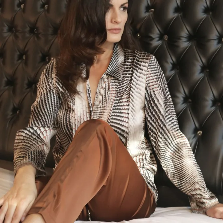 Das Schlafanzug Oberteil Boa hat einen Animal-Print in warmen Farben. Schwarz, weiß und ein paar Nuancen Kastanienbraun verbinden sich zu einem naturnahen Schlangenprint. Die Ärmelenden sind mit einer zierenden Borte benäht. Dieses Oberteil kann zu der separat erhältlichen Hose aus der Boa Kollektion kombiniert werden oder zu den schwarzen, weißen oder kastanienbraunen Seidenwäsche-Teilen von Gattina.