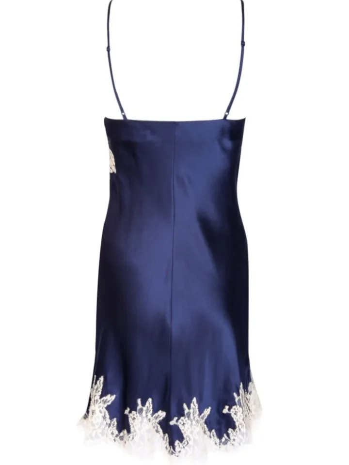 Das bezaubernde Negligé aus Seide (79% Seidenanteil) ist ca 95 cm lang, und reicht somit bis zur Mitte des Oberschenkels. Es hat einen V-Ausschnitt, welcher mit floraler Eye-Lash Spitze besetzt ist. Die Spaghettiträger des Negligés sind längenverstellbar. Auch am Saum des kurzen Nachthemdes ziert die feine Spitze das Lingerie Teil. Dieses zarte Negligé kann aufgrund des feinen Materials und des dezenten Schnittes vielseitig kombiniert werden. Produkte der selben Kollektion finden Sie seperat in unserem Shop. Das edle Zusammenspiel der glänzenden Seide und der floralen Eye-Lash Spitze formt sich zu einem femininen Negligé, der sowohl zu Kimonos oder Dessous getragen werden kann.