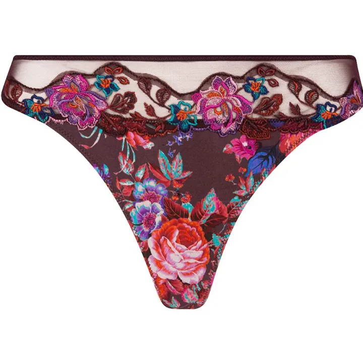 Der luxuriöse String Aveu En Fleurs aus bedruckter Seide ist hochwertige Unterwäsche von Lise Charmel aus Frankreich. Die AVEU EN FLEURS Kollektion ist eine edle Herbstkollektion von der französischen Luxus-Marke. Die zarte Kollektion ist an der Schönheit der Natur orientiert. So werden die edlen Dessous-Teile von bunten Blumen und Stickereien geziert. Die bedruckte Seide unterstreicht die Feinheit dieser Linie und macht die Stücke zu unwiederstehlichen Must-Haves. Transparenter Tüll an den Dessous-Stücken enthüllt die Haut auf sinnliche Weise und hebt die femininen Stärken gekonnt hervor.