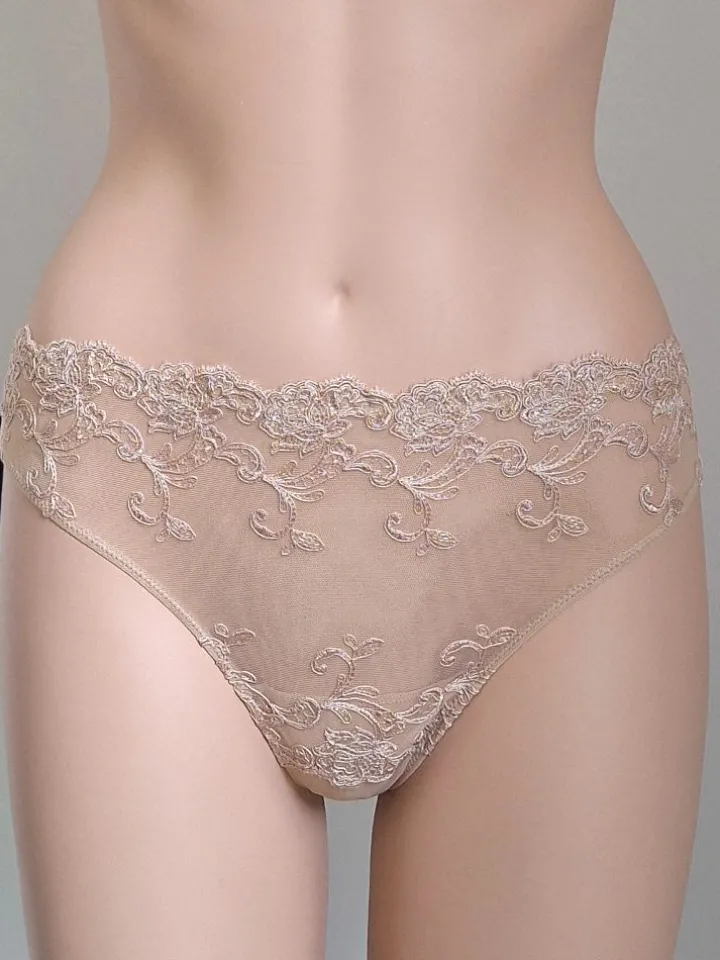 Der String Platinum Fashion ist eine luxuriöse Lingerie der italienischen Edel-Dessous Marke Ambra. Der String in Tanga-Form besteht aus bestickter Tüllspitze mit floralen Blütenmotiven, welche im oberen Bereich umlaufend bis hinten verarbeitet worden ist. Der String ist ungefüttert und daher leicht transparent. Auf der Rückseite hat er ein kleines dekoratives Satinschleifchen. Der Innenzwickel besteht aus Baumwolljersey.
