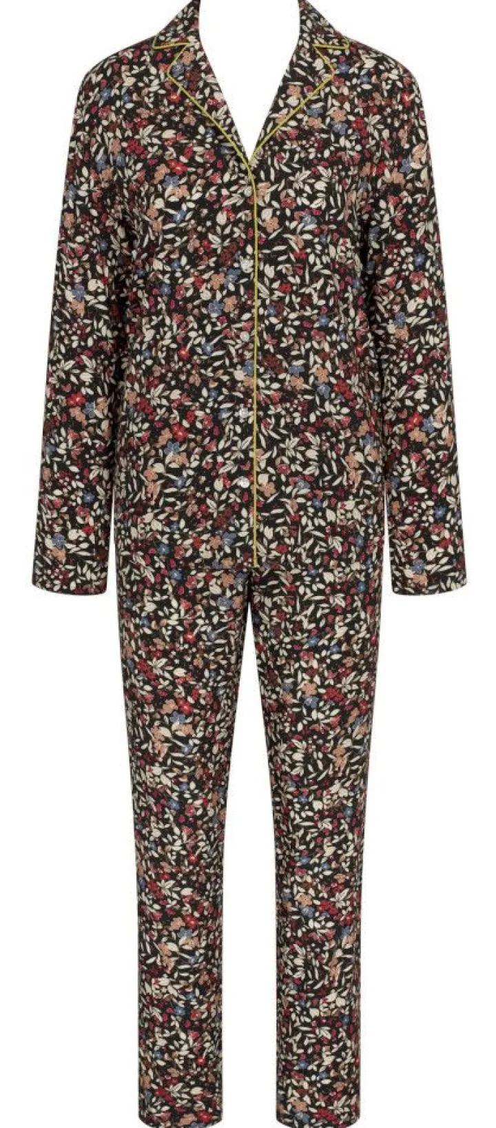 Dieser klassische Pyjama hat lange Ärmel und ein geknöpftes Oberteil. Die Hose mit Gummizug hat seitliche Taschen. Das Oberteil hat eine kontrastfarbene Biese am Revers und wird mit kleinen Knöpfen geschlossen.