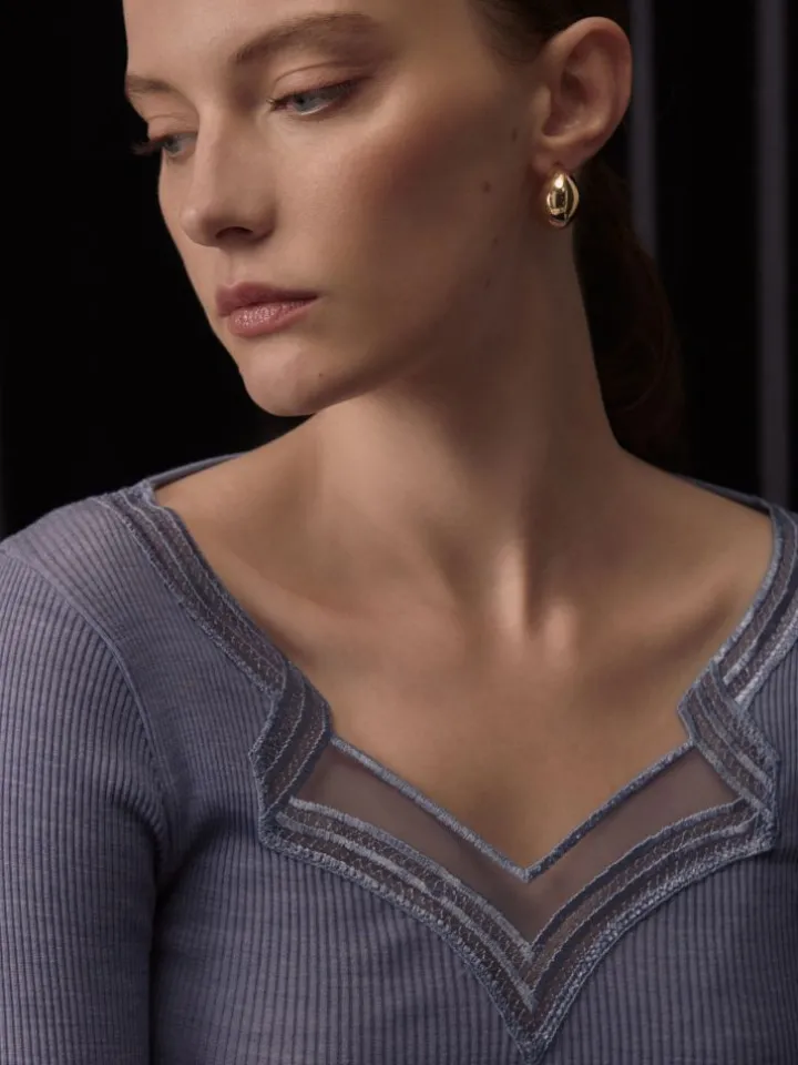 Wolle-Seide Langarm Shirt mit Spitze in jeansblau von Oscalito