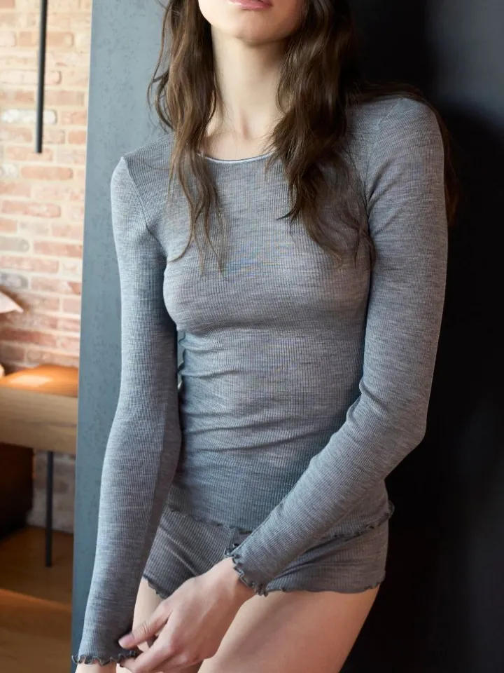 Das Grundmaterial dieser Wäsche ist ein gerippter, rundgestrickter Jersey. Dieses Material ist hautsympathisch und angenehm zu tragen. Wolle-Seide wirkt temperaturausgleichend, knittert nicht und trocknet schnell. Sie wärmt im Winter und ist ausgleichend in der Übergangszeit. Außerdem ist dieses edle Material leicht elastisch und passt sich daher gut der Körperkontur an. Da dieses Shirt aus einer rundgestrickten „Schlauchware“ gefertigt wird, ist es seitlich nahtlos.