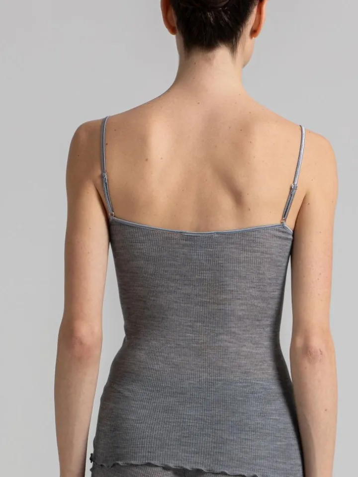 Dieses hochwertige Wolle-Seide Spaghettiträger Top Romilda von Boglietti ist aus einem hochwertigen, rundgestrickten Rippjersey gefertigt. Das Top hat eine Länge von ca. 60 cm und verstellbare Spaghettiträger aus Paspel. Der Ausschnitt ist auch mit Paspel verziert.